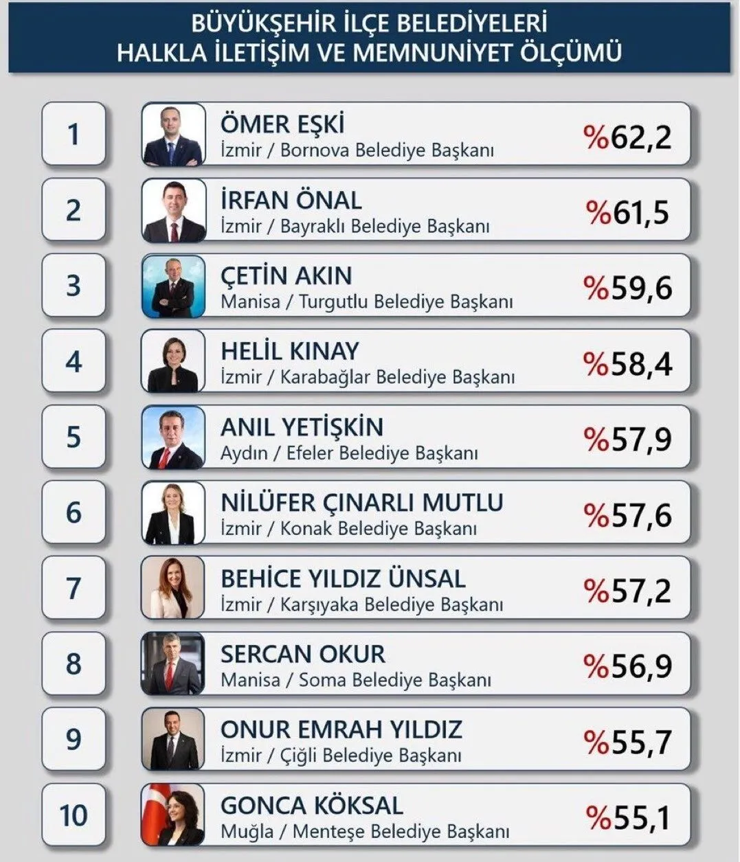 Listenin en dikkat çeken noktası, ilk 10 sırada İzmir’den tam 6 belediye başkanının yer alması oldu.